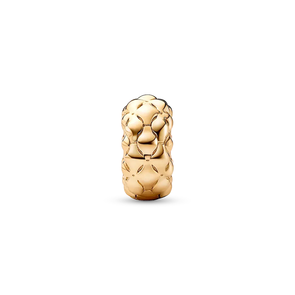 Bring even more of the iconic studded texture into your look with the Studded Pandora Clip Charm. With its pyramid and spherical stud texture and a thin profile, this clip charm in our 14k gold-plated unique metal blend will feel right at home on your studded chain bracelet, as its pattern echoes the new Pandora icon. The charm features silicone grips on the inside and cannot be styled on threads, so it will stay fixed in one place on the chain as you move, while spacing out your charms. Create a camouflage-style look by adding it to the studded chain for a bold take.