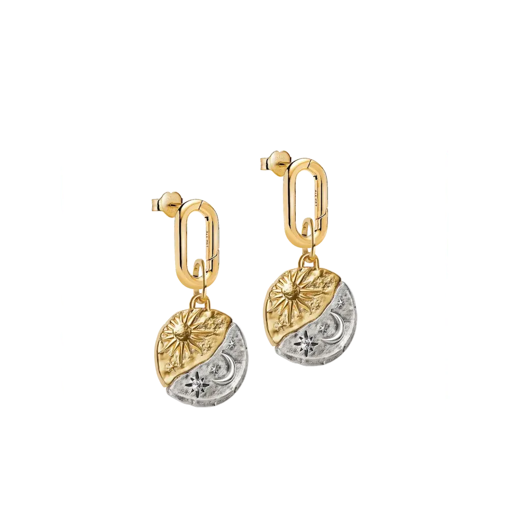 Keep rising. This mixed metal medallion features a moon and stars motif with the Latin mantra ‘AD ASTRA PER ASPERA’. Style it on our front-facing openable stud earring for a personal take on meaning and shine.