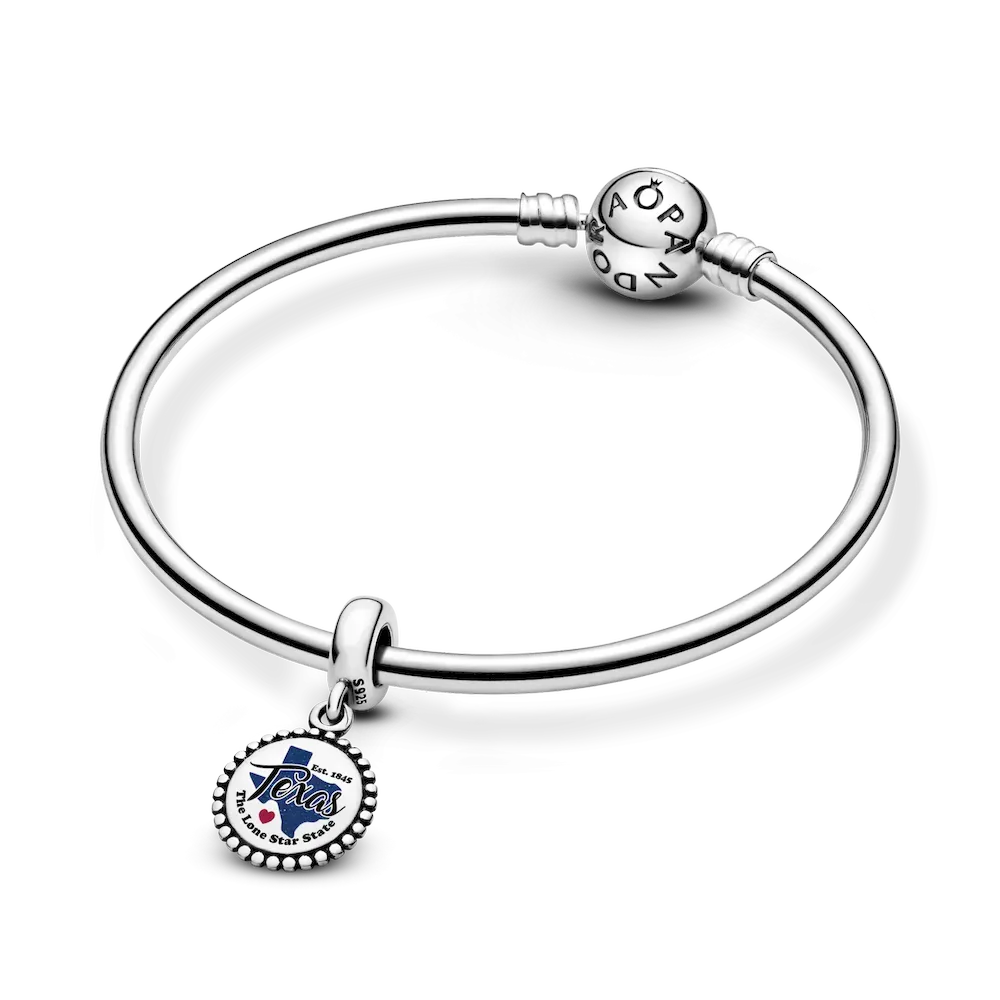Add a piece of the Lone Star State to your style with this sterling silver dangle charm. Featuring a state-shaped silhouette in glossy blue enamel, a small red heart underneath, and “Texas” beautifully scripted across in large lettering—because everything’s bigger in Texas!