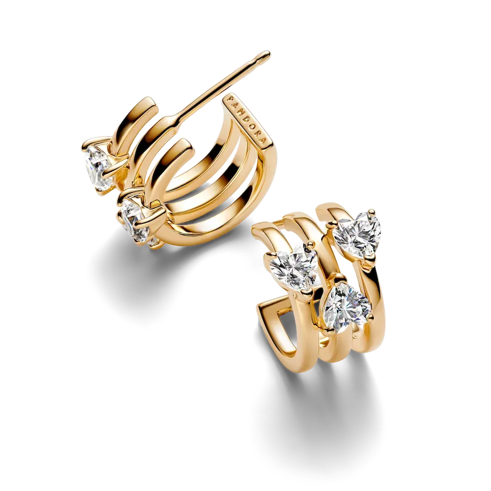 Celebrate love and individuality with these contemporary sparkling hoops. Made from our 14k gold-plated unique metal blend, these earrings feature six heart-cut cubic zirconia that overlap in a dynamic silhouette. A trio of lines are decorated with a smattering of hearts. Perfect for adding romantic sparkle to your jewelry, these earrings are versatile enough for any occasion.