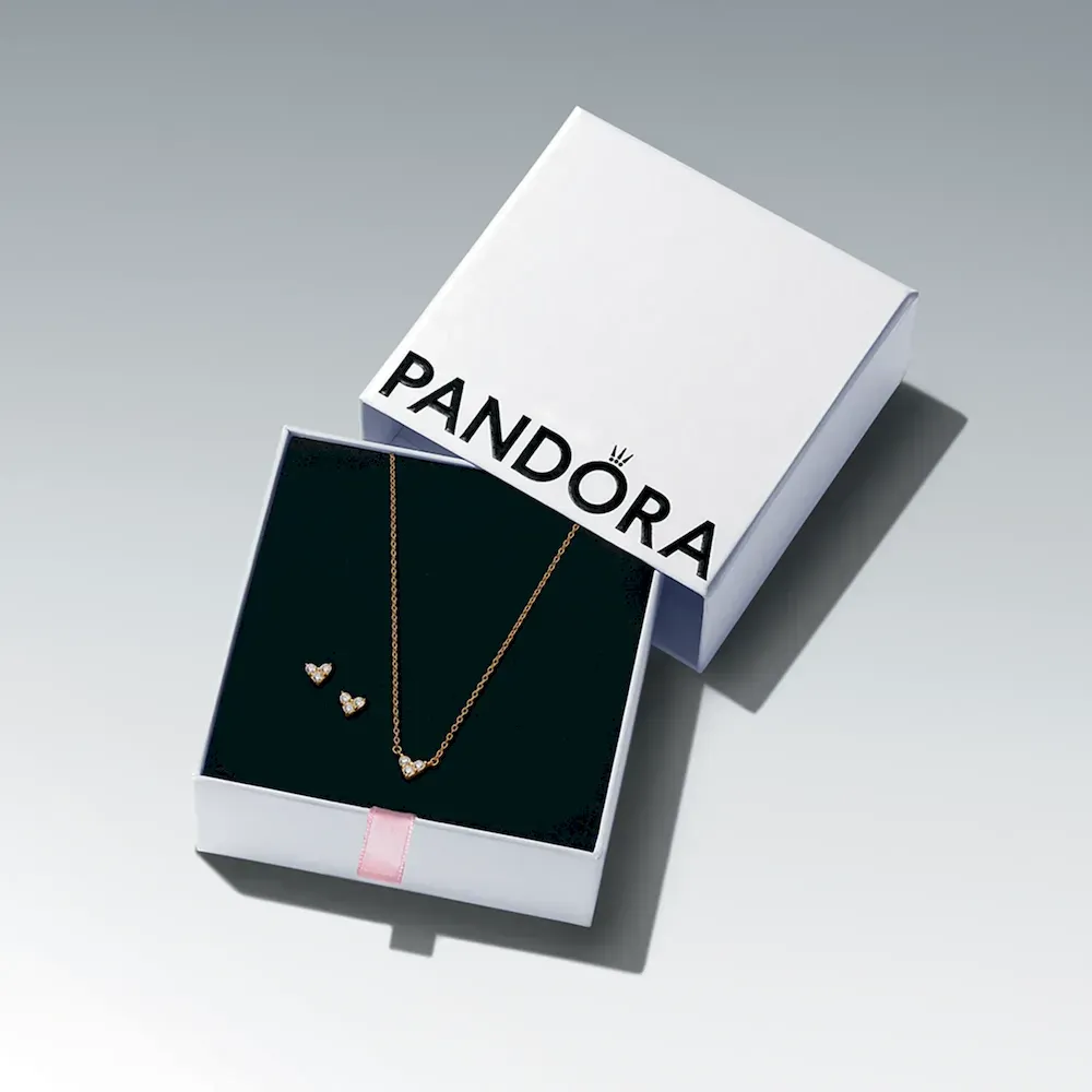 Gifts for the greatest love of all. Inspired by its irresistible nature, the necklace and earrings set each feature three sparkling stones accented by rounded beads in an elegant heart-shape style. Lovingly crafted in 14k gold-plating, these hand-finished pieces are perfect for the one who always brightens your days.