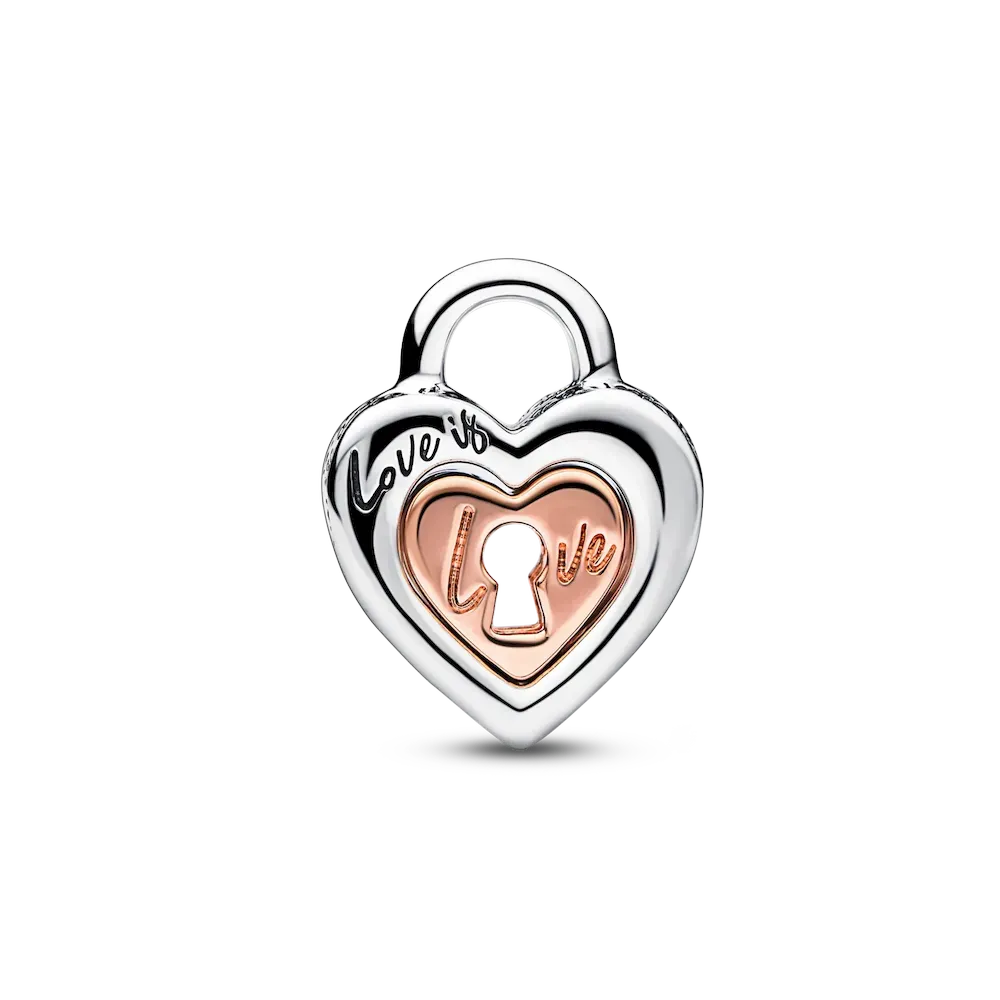 Share the love with our Two-tone Padlock Splittable Heart Charm. Hand-finished and engraved in multiple places with the message “Love is love”, this sterling silver charm features a 14k rose gold-plated removable inner heart detailed with a keyhole cut-out that forms the ‘o’ in its “Love” engraving. Wear the charms together, separately or split the charm with someone special.