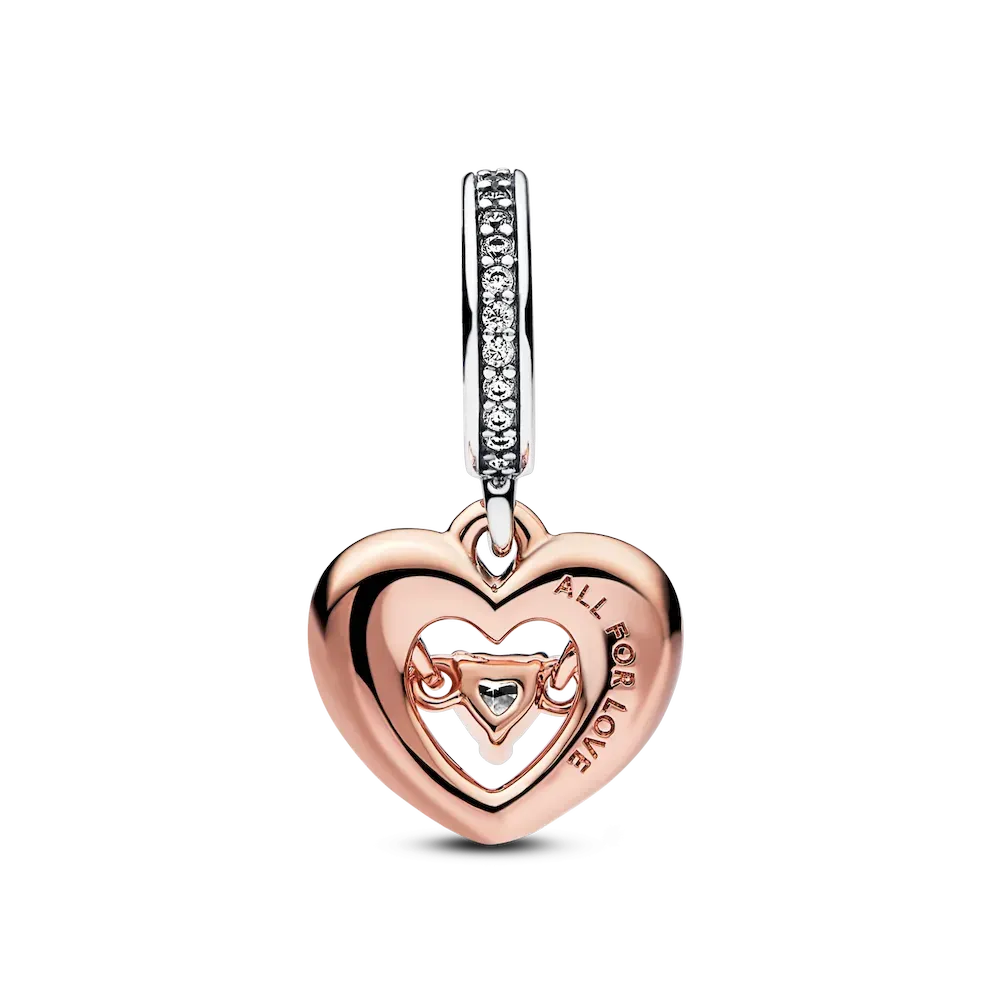 Wear your heart on your sleeve with our Two-tone Radiant Heart Dangle Charm. This 14k rose gold-plated open heart charm is detailed with hand-applied red enamel and a floating cubic zirconia heart within, symbolising the radiating energy of love. A sterling silver pavé bail and