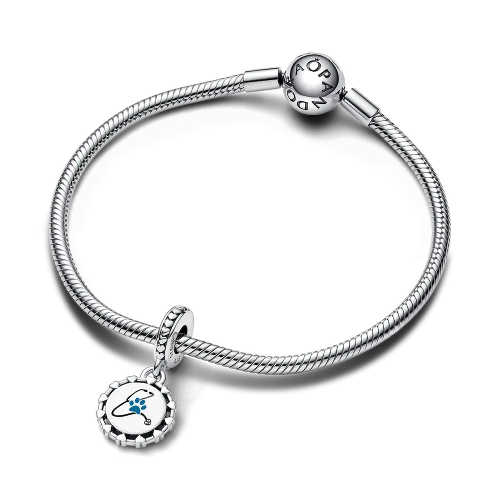 Celebrate the dedication of veterinarians with this Engravable Veterinarian Dangle Charm in sterling silver. Featuring a row of hearts and a veterinary symbol with a stethoscope and blue paw print, it represents care for animals. Personalize the back with a custom engraving to create a meaningful tribute to those who provide loving care.