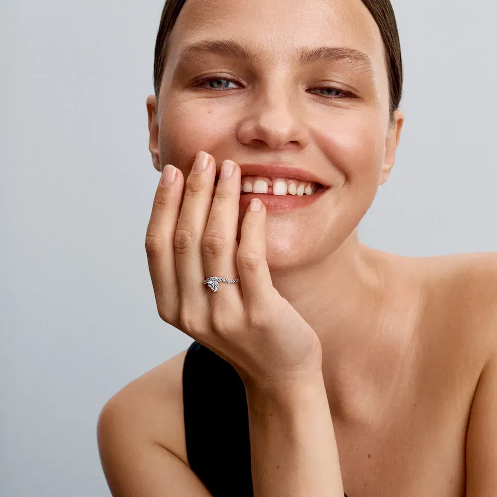 A wavy band combines with a heart-shaped stone in this unique ring design. Crafted from sterling silver, it showcases a prong-set heart-cut cubic zirconia offset from a sparkling pavé band. A contemporary piece with an elegant, flowing design, it will pair perfectly with your favorite sterling silver jewelry.