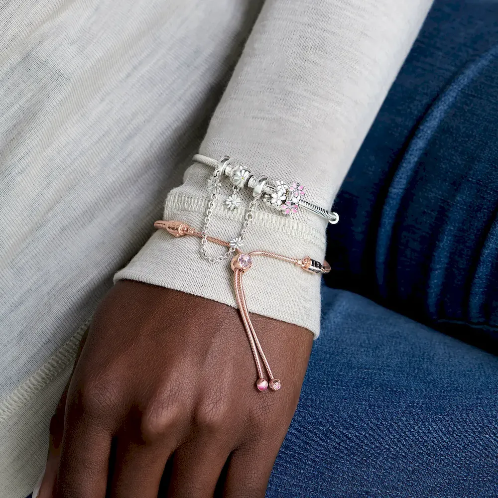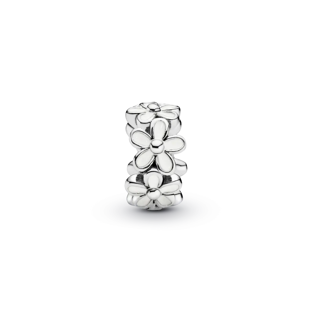 Daisies are a symbol of innocence and purity, freedom and fortitude. Encircled with white enamel daisies in a nod to the popular daisy chain, this pretty spacer charm in sterling silver lends natural appeal to your Pandora Moments bracelet. Add the simple design to your look to represent something you love.