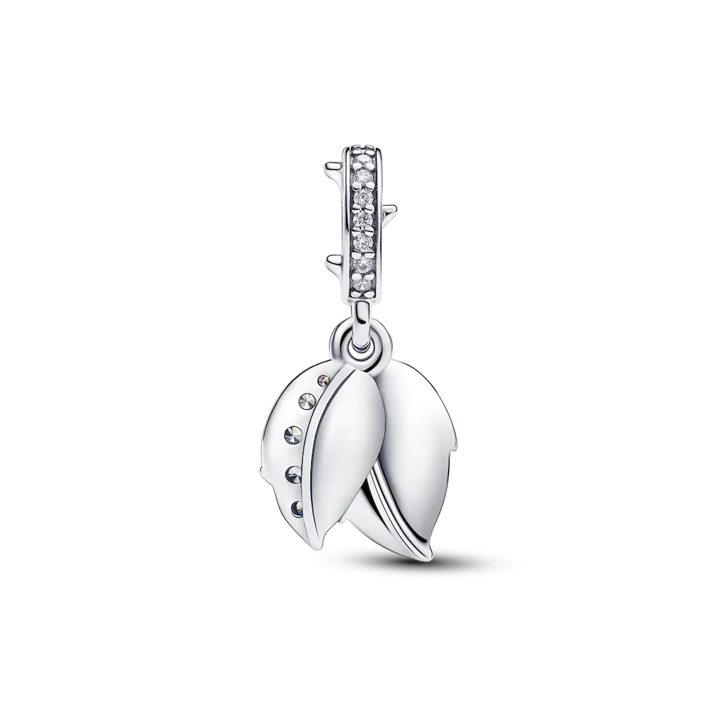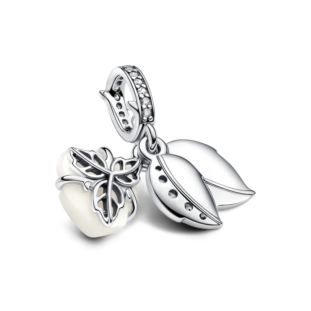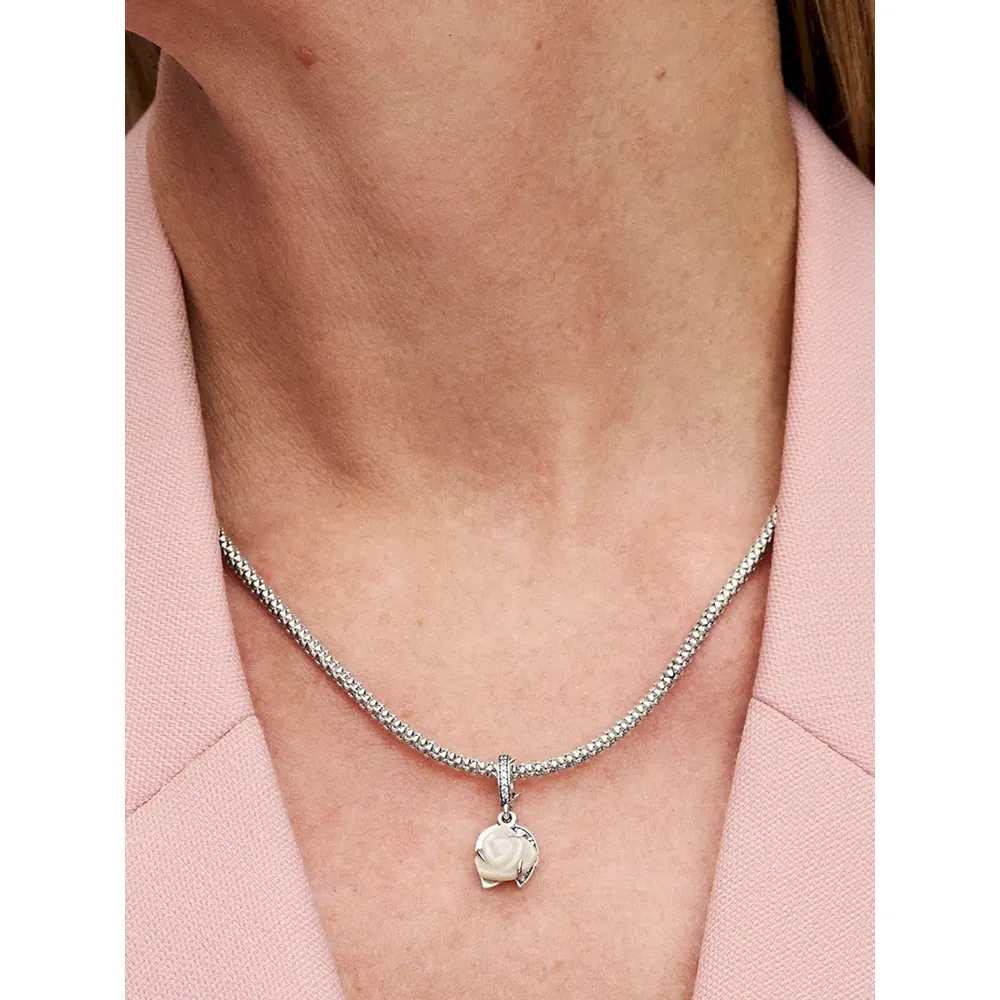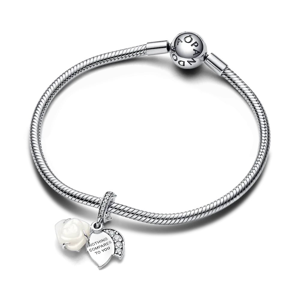 Embrace elegance with the White Rose in Bloom Double Dangle Charm, a sterling silver piece filled with love and symbolism. The intricately designed charm features a white bioresin man-made mother of pearl rose, its layered petals capturing the essence of a blooming flower. Adorned with clear cubic zirconia, this charm is a sparkling tribute to love. The engraved message