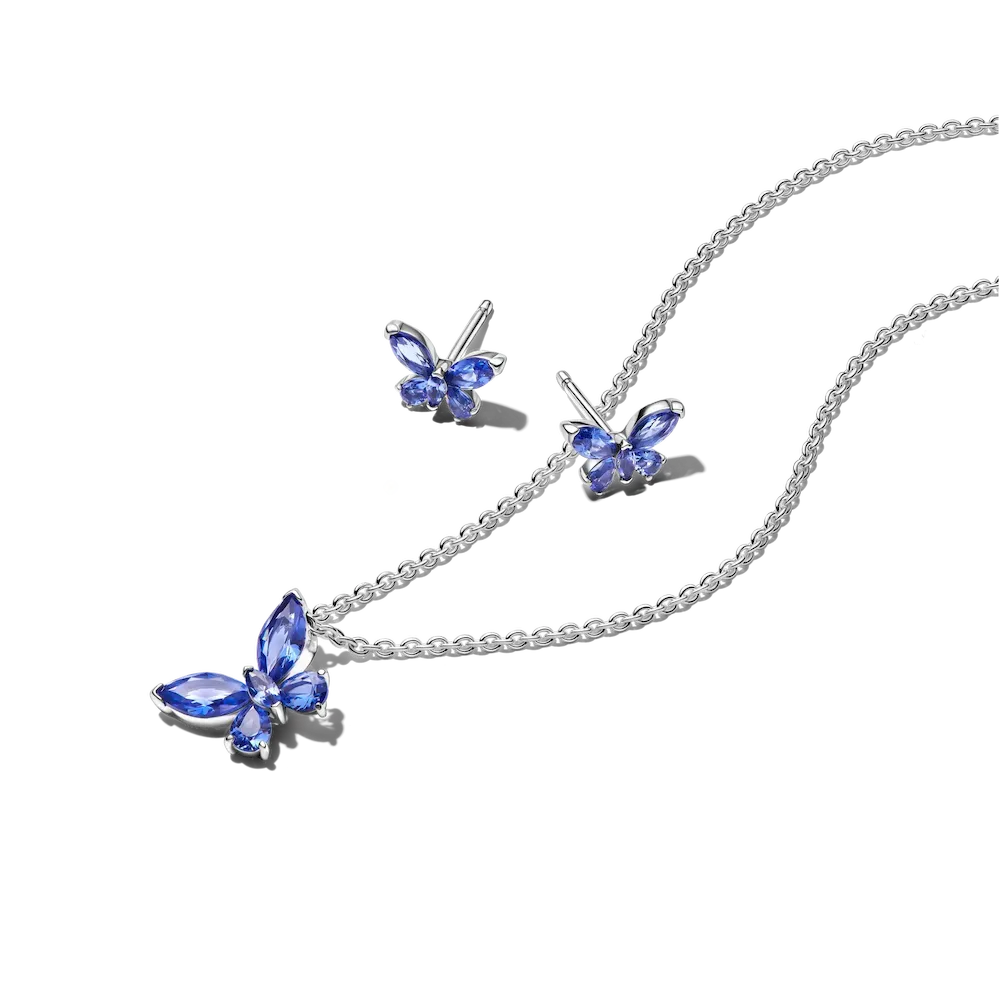 Give a gift that flutters and shines. Our timeless butterfly-themed gift set features a collier necklace and stud earrings in sterling silver, set with blue man-made crystals for a pop of vibrant colour.